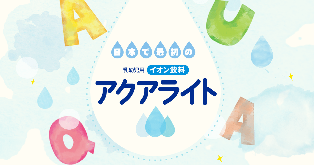 アクアライトとは小児科の先生とつくった日本で最初の乳児用イオン飲料です。赤ちゃんの体内にすばやく吸収されるように水分やイオン(電解質)を設計しています。たくさん汗をかいたときやお風呂上りや散歩の後の水分補給に。